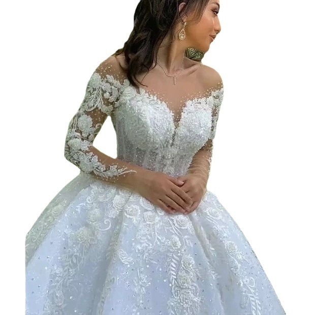 White Wedding Dress 2025 New Mid-Rise Long-Sleeved Lace French High-End One-Word Shoulder Drag Tail Wedding Dress Summer
